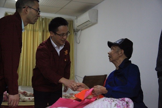 志愿者为97岁的卧床老人送祝福