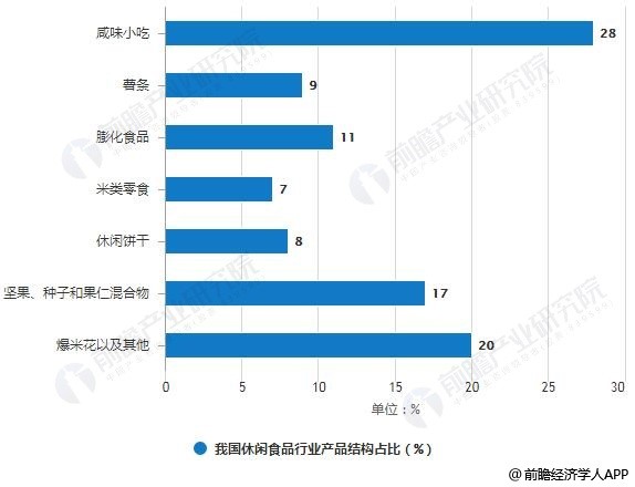 休闲食品行业可以分为坚果、种子和果仁混合物,咸味小吃,薯条,膨化食品,米类零食,休闲饼干,爆米花以及其他。其中收入规模最大的就是咸味小吃,2018年的市场规模占整个休闲食品销售额的28%。之所以咸味休闲食品市场最大,主要是咸味小吃需求稳定且呈刚性,用户粘性强。其次,市场规模占比位列第二位的为坚果类食品,占比17%。