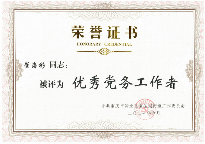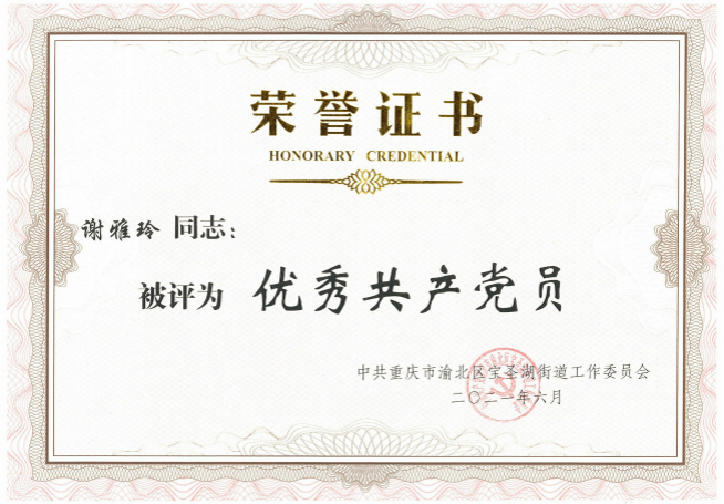 近日,开云英超官网_开云online(中国)党支部荣获渝北区宝圣湖街道“先进基层党组织”荣誉称号,支部谢雅玲同志获评“优秀共产党员”,崔海彬同志获评“优秀党务工作者”。