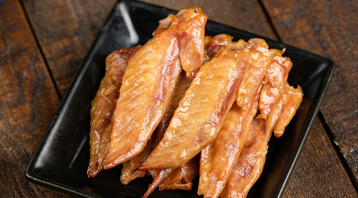 特点:以优质鸡翅为原料,配以数十种天然香料,川菜技法卤制而成。产品色泽明亮,香气浓郁,肉质绵软,味道鲜美。